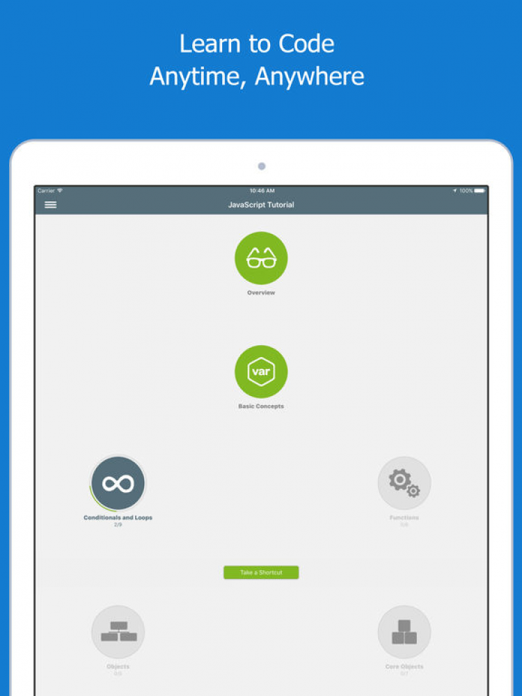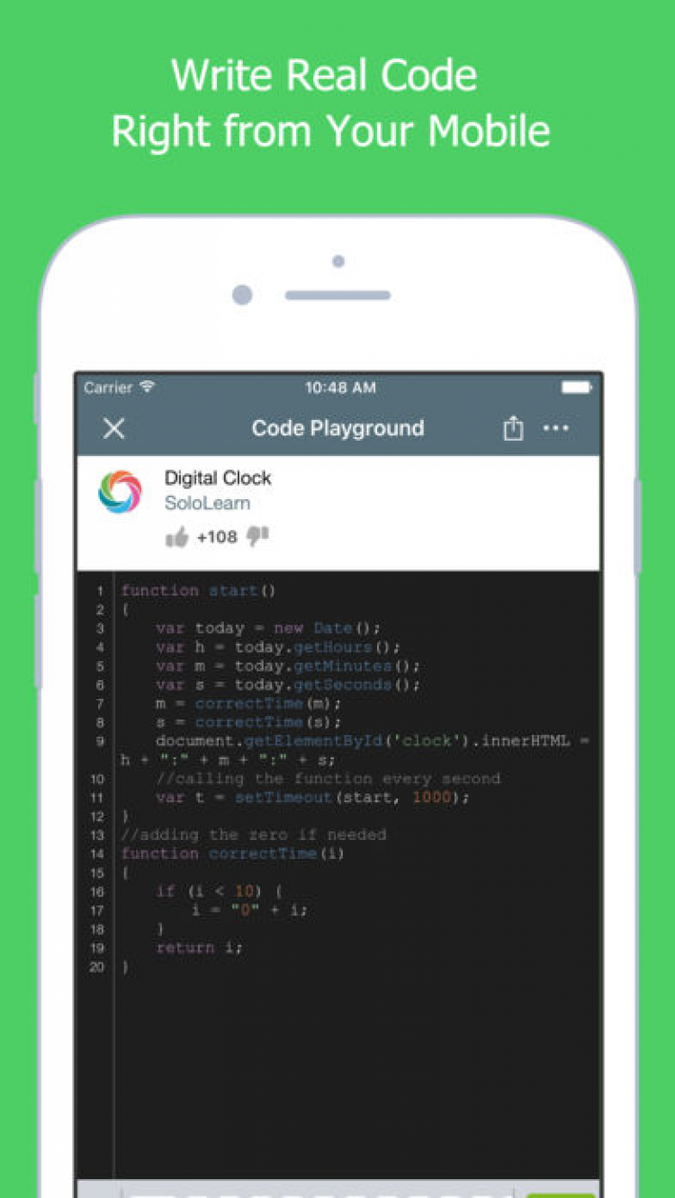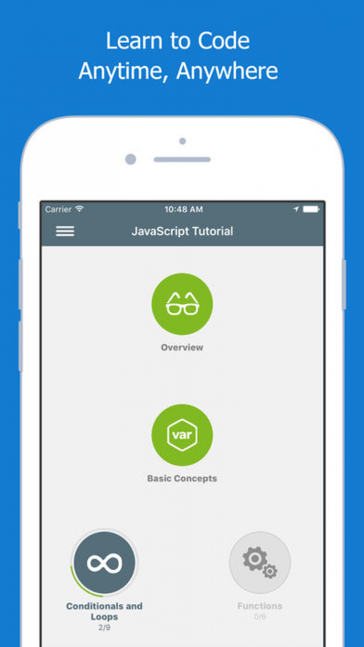 Learn JavaScript Это приложение обучит вас тонкостям Javascript: вы сможете создавать интерфейсы, делать веб-сайты более интерактивными, менять содержание сайтов, а так же находить пути решения частых проблем. Приложение Learn JavaScript содержит тщательно подобранные видео уроки, увлекательные упражнения и тесты. Учитесь играя и получите новые, полезные навыки по применению Javascript, используя только ваше мобильное устройство. Разблокируйте новые уровни, загадки, набирайте очки и соревнуйтесь с другими учениками со всего мира.
