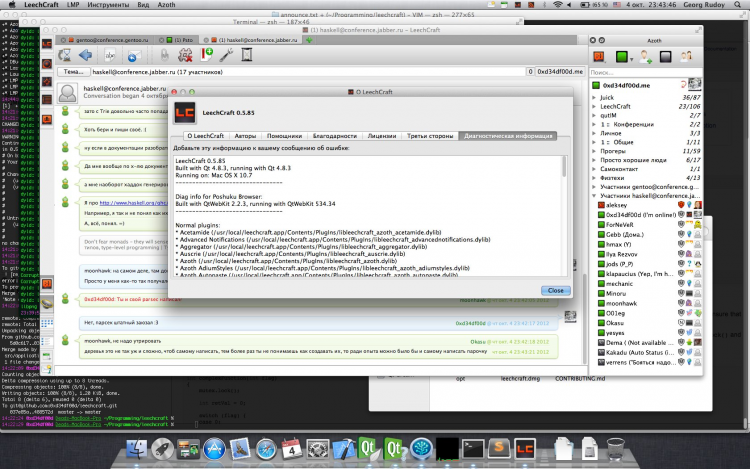 - Мультипротокольный модульный IM-клиент, в настоящее время поддерживающий XMPP (Jabber), IRC, WLM/MSN, MRIM и кучу других протоколов.
