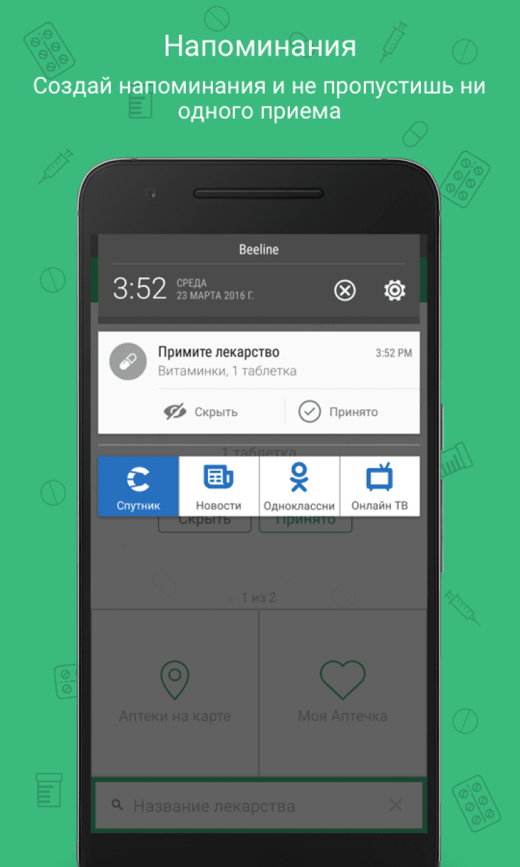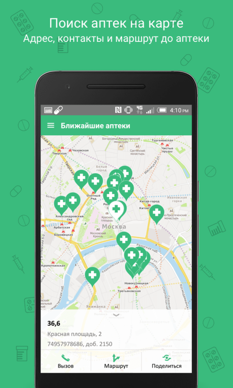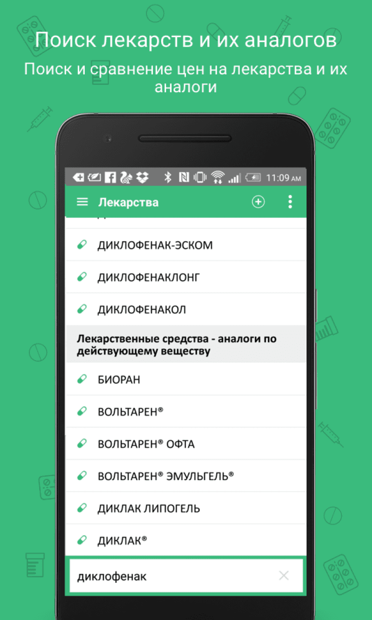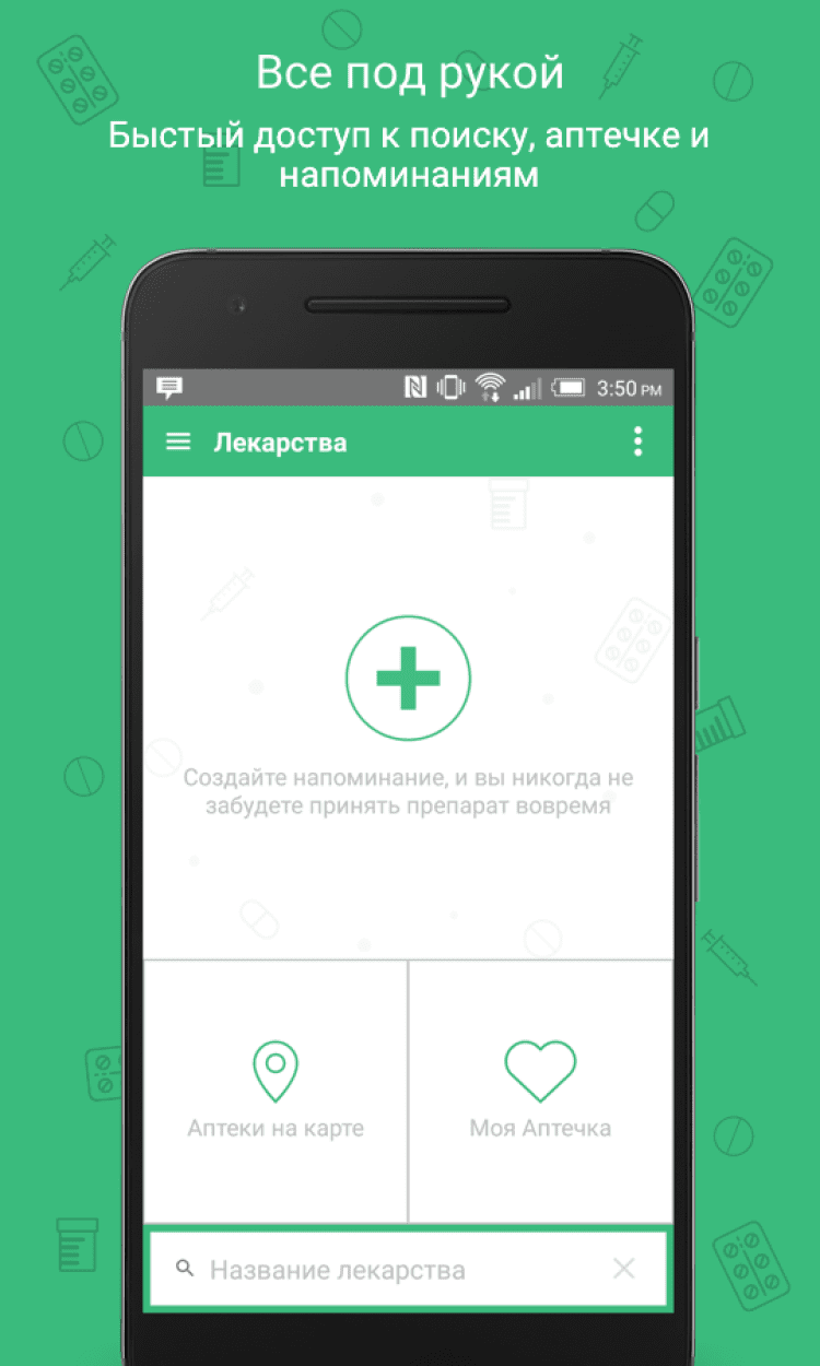 Лекарства Это приложение позволит вам быстро найти ближайшую аптеку на карте, а так же прочесть описание нужного вам препарата и узнать его цену. Вы сможете выполнять поиск как по названию лекарства, так и по действующему веществу.