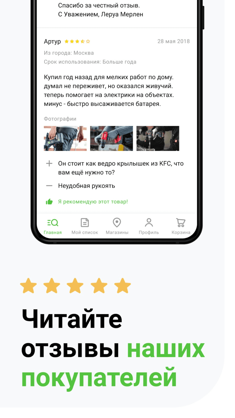 Леруа Мерлен Официальное приложение Леруа Мерлен, которое позволит вам быстро просматривать каталог компании и выполнять поиск товаров по штрих-коду. Так же, вы сможете составлять список покупок, просматривать адреса ближайших магазинов на карте и прокладывать маршрут к ним, а так же связываться с сотрудниками компании через форму обратной связи.
