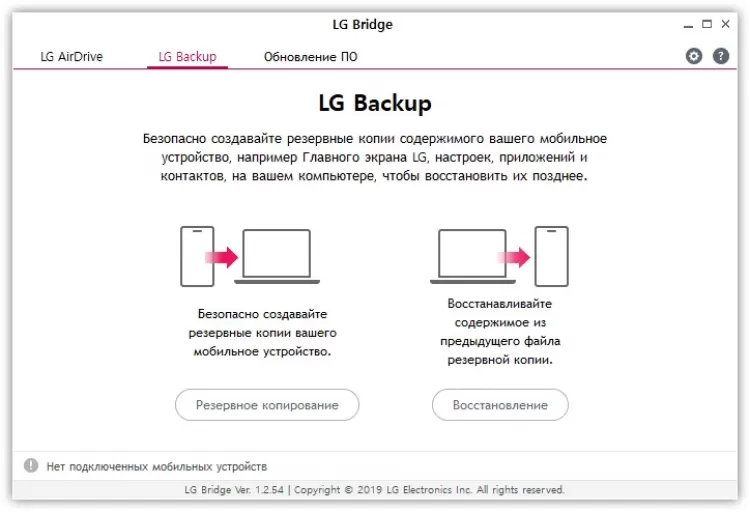 Название второй вкладки говорит само за себя. Речь идёт об LG Backup. Как понятно из названия, здесь вы можете воспользоваться функцией создания резервных копий практически любых данных с гаджета, а также текущего состояния системы. Разумеется, при помощи этой программы можно также и восстановить данные из бэкапов. Для использования функции требуется подключение мобильного устройства к компьютеру по кабелю.