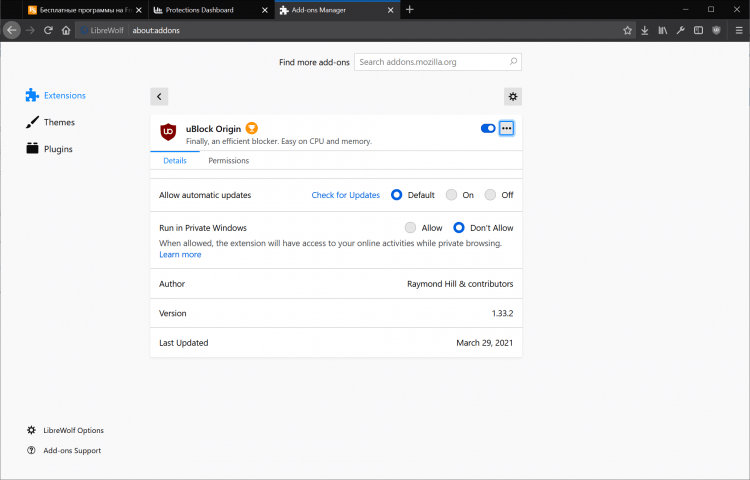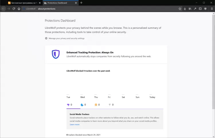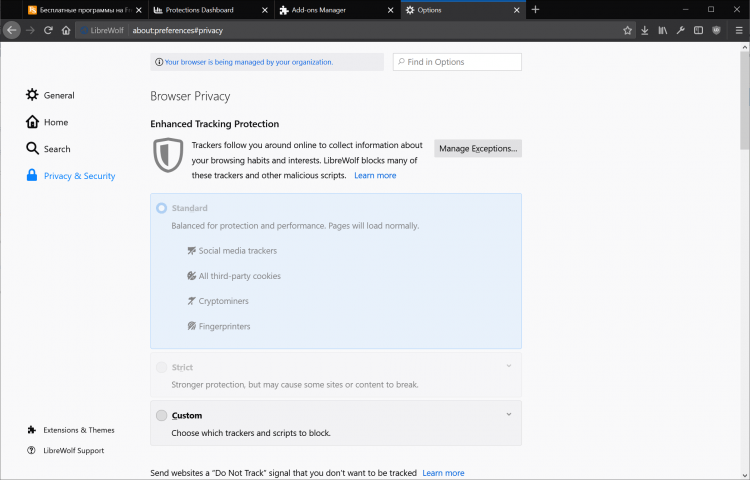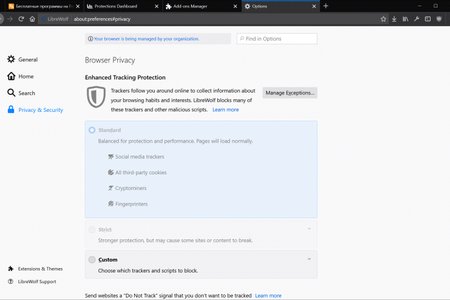 LibreWolf - это форк Firefox, неофициальный проект, представляющий собой модифицированную версию популярного браузера с целым рядом изменений и оптимизаций настроек для защиты конфиденциальности пользователя. В нем сохранены все важные функции, но убраны инструменты сбора информации о пользователях и прочие ненужные опции.