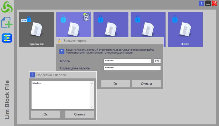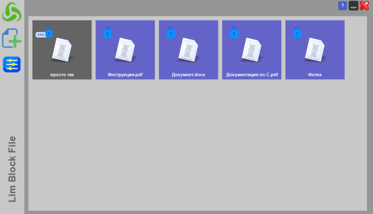 Lim Block File Программа для блокировки файлов. С помощью программы можно установить пароль на файл, спрятать файл, заблокировать доступ к файлу, так как после блокировки файл исчезает и о его существовании мало кто узнает. Добавив нужные файлы в программу можно на файлы ставить пароли, а можно блокировать и без пароля, файл будет заблокирован, но в программе его можно будет открыть без пароля. В настоящее время, это первая тестовая версия программы, основная часть уже работает и можно легко блокировать файлы на компьютере или флешке. Заблокированные файлы на флешке так и остаются на флешке и доступны на другом компьютере с программой Lim Block File.