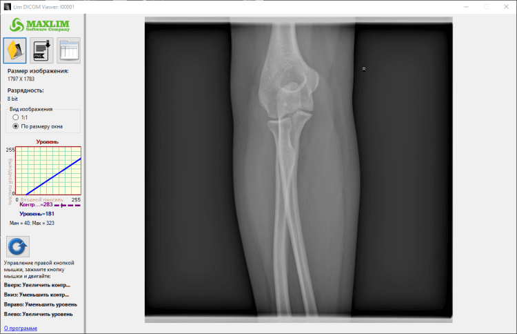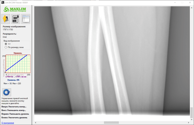 Lim DICOM Viewer — это программа для просмотра рентгеновских снимков формата DICOM. В программе Вы можете открыть DICOM файл (файл с рентгеновским снимком), посмотреть информацию о снимке (теги), сохранить снимок в виде изображения, а самое главное можете изучать рентгеновские снимки, управление осуществляется правой кнопкой мышки. Зажимаете правую кнопку мышки и двигаете вверх или вниз для регулирования контрастности изображения, а двигая мышку с зажатой правой кнопкой вправо или влево, Вы регулируете уровень изображения.