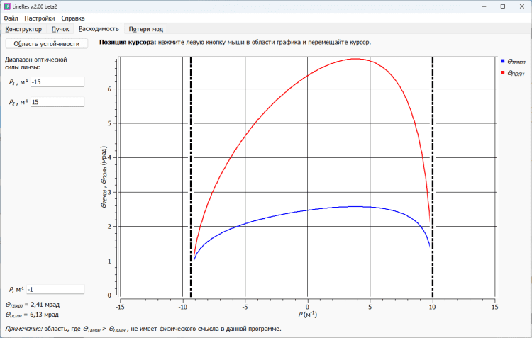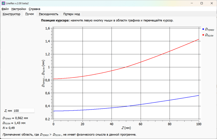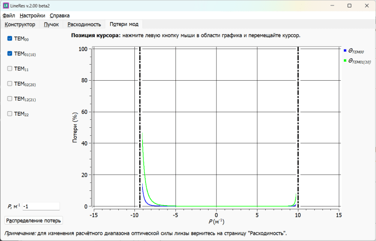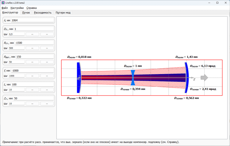 LineRes — это программа, которая предназначена для расчёта двузеркальных устойчивых лазерных резонаторов с линзой внутри. Позволяет строить каустику лазерного пучка, рассчитывает её характеристики (размер поля на зеркалах и в линзе, а также в произвольном поперечном сечении резонатора; фокусировку мощности в любом поперечном сечении пучка внутри резонатора). Кроме того, позволяет рассчитывать расходимость излучения в зависимости от оптической силы линзы. Расчёт ведется как для нулевой моды резонатора, так и для всего пучка. Для нулевой моды и мод Эрмита-Гаусса 01...22 рассчитываются апертурные потери за полный обход резонатора в зависимости от оптической силы линзы.