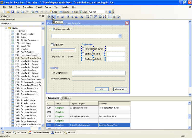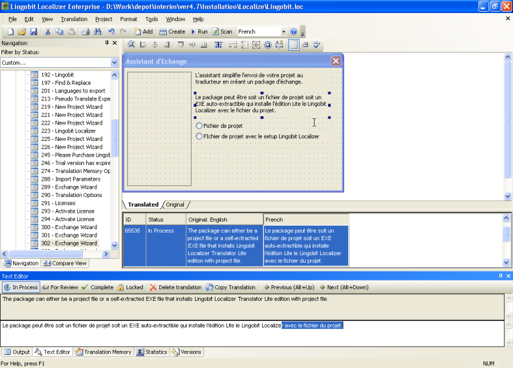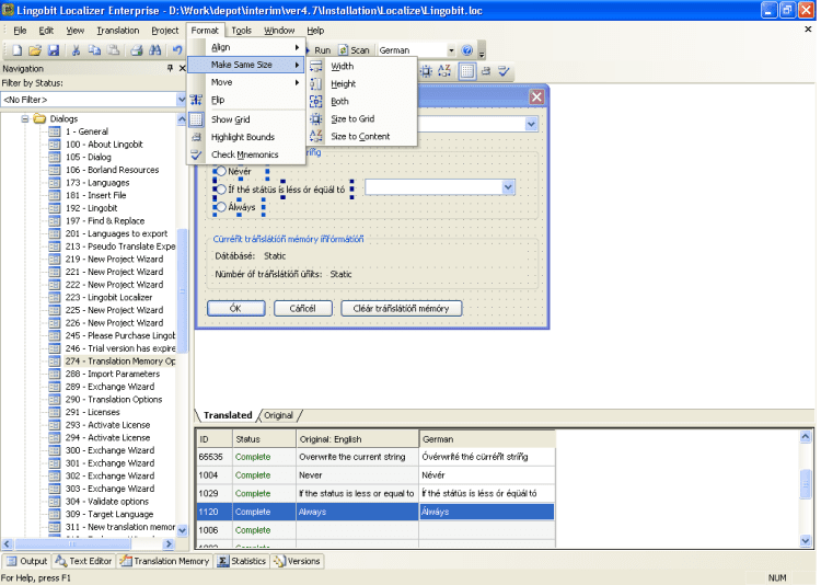 Lingobit Localizer - это одно из лучших средств для перевода интерфейса программы с одного языка на другой. Редактирование диалогов, перевод меню, строк и всех остальных ресурсов прямо в exe файле. Подготовка файлов с заданиями для переводчиков, сохранение всех сделанных переводов при переходе с версии на версию, возможность проверить насколько ваша программа готова к локализации, поддержка более 180 языков - это только часть возможностей программы. Поддерживаемые форматы: MFC, .NET, WPF, Delphi, Java, HTML, XML, Html Help, INI, PHP, Базы данных (SQLServer, Oracle, MySQL и др.).
