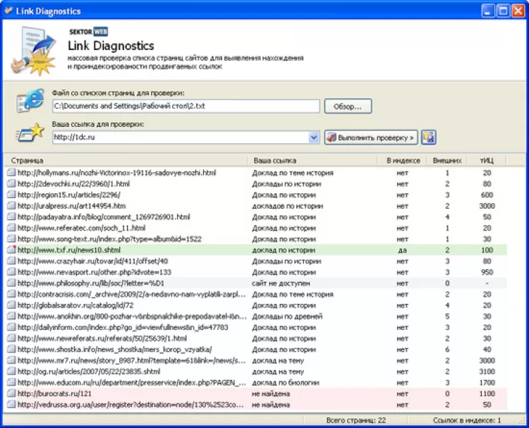 Link Diagnostics - это утилита для массовой проверки списка страниц сайтов, из текстового файла, для выявления нахождения на них Ваших ссылок.
