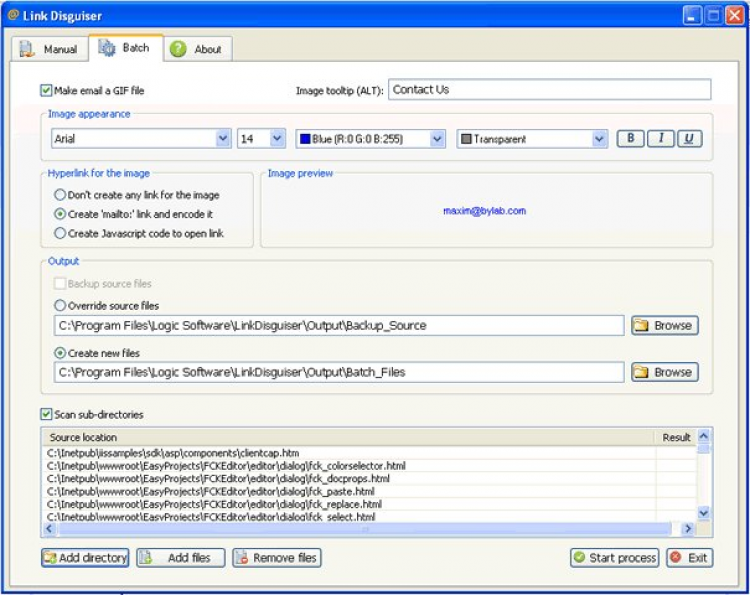 Link Disguiser - это эффективная система, которая не позволяет спам-ботам видеть email`ы на вашем сайте. Link Disguiser даёт веб-мастеру надёжную и простую защиту от спама. Link Disguiser позволяет конвертировать email`ы, написанные текстом, в изображения, кодировать email в теге href, кодировать тег "mailto:" JavaScritpt`ом, автоматически внедрять защиту в выбранное множество файлов в режиме Batch Mode, генерировать код защиты с возможностью его дальнейшей кастомизации. По статистике, 70% траффика электронной почты - это спам. Спам уже давно признан виртуальной чумой 21 века, и сегодня Link Disguiser является эффективным средством защиты.