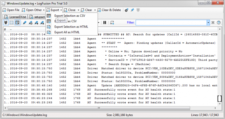 - Экспорт всех или выбранных записей из лога в HTML и CSV файлы.