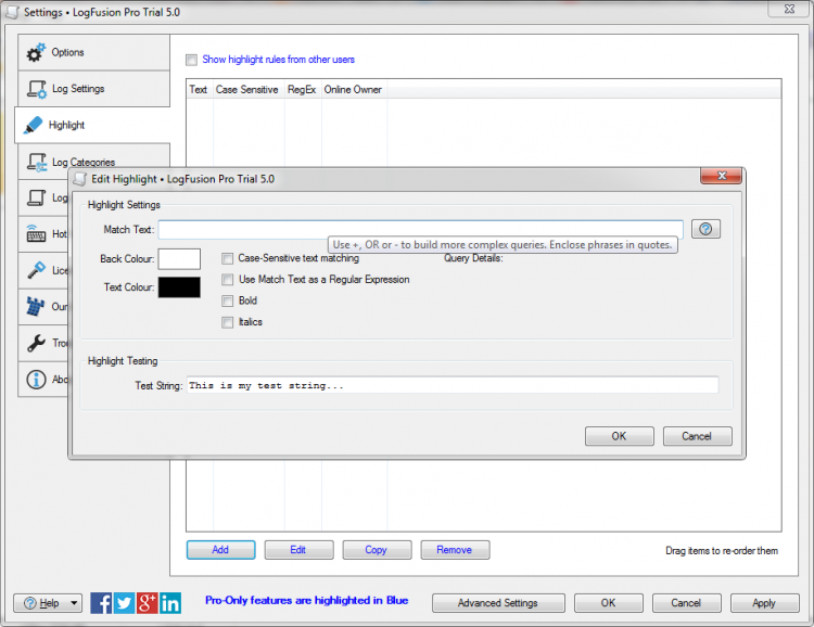 - Синхронизация правил подсветки строк через Интернет с другими компьютерами;