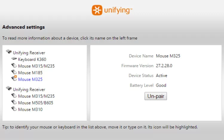 Фирменная технология Logitech позволяет подключать сразу несколько устрйоств (клавиатуры, мыши, геймпады и пр.) к одному приемнику. Данная программа позволяет управлять такими устройствами, подключать и отключать их от приемника. А в специальном Расширенном режиме можно узнать статус всех сопряженных устройств, их уровень заряда батареи и версию прошивки.