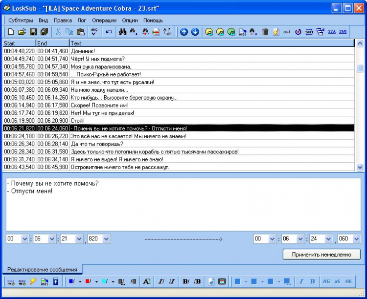 LoskSub - это удобная программа для редактирования субтитров в формате srt, smi, ssa и ass. В числе её основных возможностей: сдвиг по времени всех сообщений (или на заранее определённом интервале), замена "одиноких" точек в srt сабах, изменение длительности показа всех сообщений (или на интервале), поиск и удаление пустых строк, возможность "умной" замены текста, подсветка синтаксиса в srt сабах, перенумерование всех сообщений в srt сабах, преобразование субтитров из одного формата в другой, проверка орфографии, объединение сообщений в одно, выделение переносов smi субтитров пробелами, удобная вставка и редактирование html скриптов в srt субтитрах, контроль редактирования субтитров с помощью специального видео-окна, а также функция (специально для анимешников) быстрой замены приставок "тян" и "чан" и не только. В поставку программы входит утилита Subtitles Equater, предназначенная для переименования субтитров под название видео-файлов. Так же поддерживается обработка сразу нескольких файлов, что делает подгонку субтитров именно под ваш видео-файл намного удобнее.