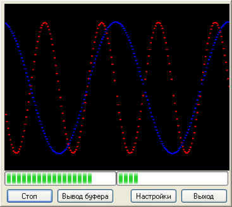 Также, в качестве вспомогательного режима (до того, как будет собрана схема подключения к выходам LPT порта), может быть использован монитор компьютера - вывод на экран разноцветных полос (линий или эллипсов). Также программа может нарисовать "осциллограмму" моно или стерео звукового сигнала. Аудио данные после нажатия кнопки Старт начинают постоянно считываться блоками в буфер данных, а затем обрабатываться согласно настройкам. Размер рисунка можно изменять вместе с размером окна Монитор как по горизонтали, так и по вертикали, растягивая (сжимая) окно указателем мыши.