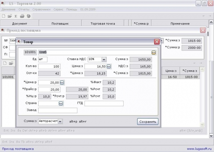 Количественно-суммовой учет или суммовой учет торговых операций по каждой торговой точке ведется в зависимости от вида учета продаж. В наличии печать приходных и расходных накладных, ценников, товарных отчетов, остатков товара и др. Для автоматизации операции прихода поставщика применяется настройка карточки прихода товара.