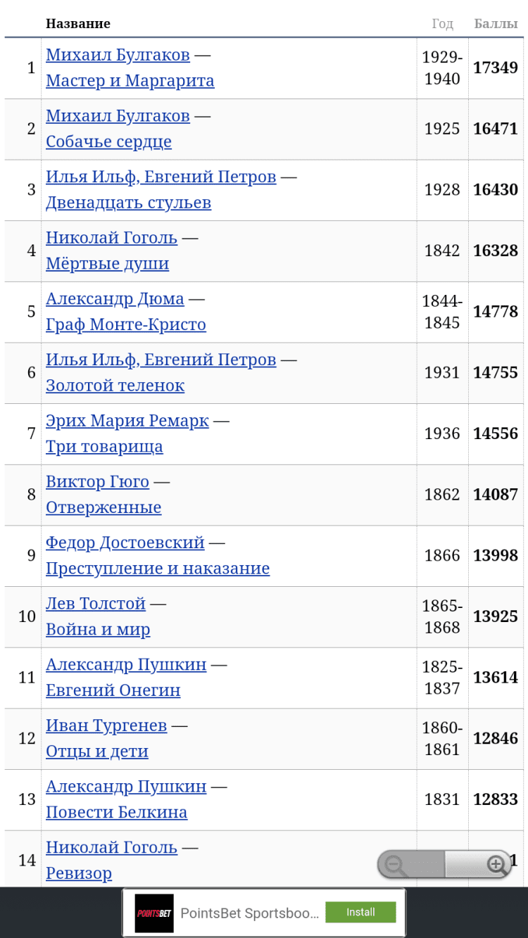 - Правдивый рейтинг на основании отзывов реальных людей. Рейтинг произведений основан на данных одноименного сайта, где голосуют читатели. Список формировали тысячи людей с разных концов планеты. Хотя большую часть списка в рейтинге составляют произведения классической литературы, в него входят и современные шедевры. Проголосуйте за свой вариант и внесите вклад в формирования рейтинга.