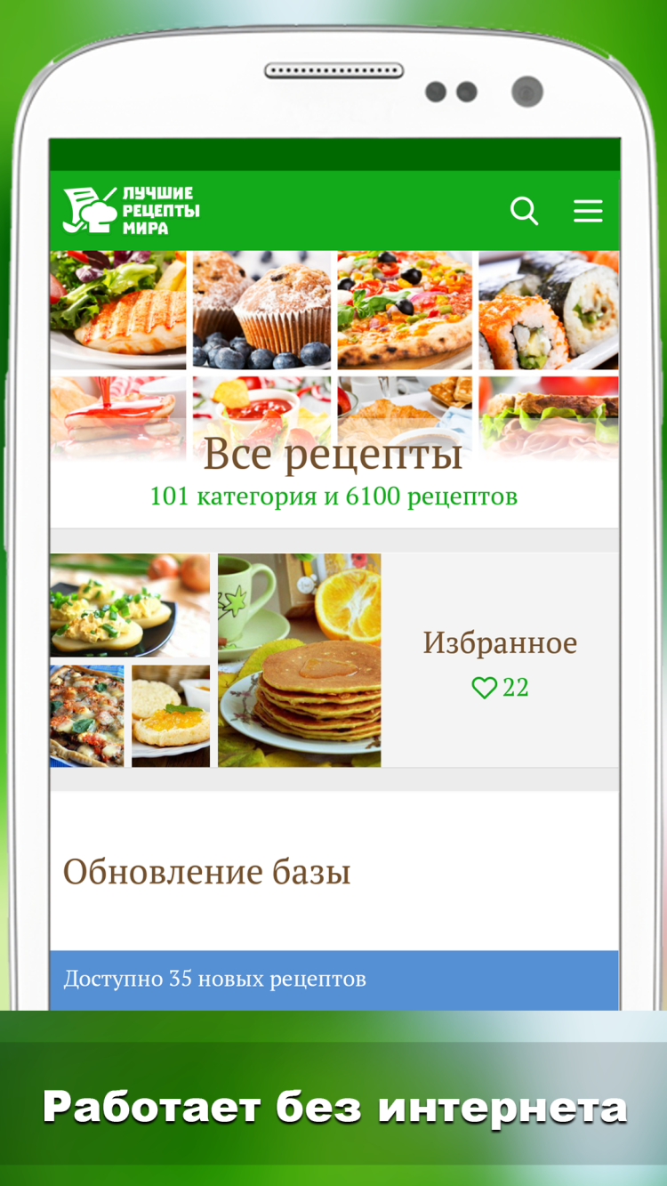 Лучшие рецепты мира Рецепты самых интересных блюд мира с фотографиями и подробным описанием. Добро пожаловать в книгу фото рецептов! У нас Вы найдете рецепты самых интересных блюд мира. Все кулинарные рецепты собираются из открытых источников только с фотографиями и подробным описанием. В нашей базе собрано более 3000 рецептов. База рецептов регулярно обновляется. Приложение может полноценно работать без подключения к Интернету (для этого необходимо около 500 Мб свободного места в памяти устройства). Для удобства пользования в приложении есть избранное, список покупок, поиск по рецептам.