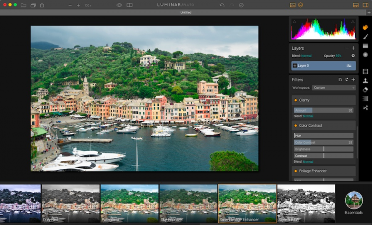 Из главного окна Luminar пользователь может легко получить доступ ко всем инструментам и фильтрам и сгруппировать их в рабочие области - workspaces. Все фильтры которые находятся в программе имеют встроенные подсказки и наглядные примеры, чтобы помочь пользователям всех уровней пользоваться даже самыми технологичными инструментами. Каждый набор настроек можно сохранить в качестве пресета, которые затем можно применить к другим фотографиям. Luminar включает большое количество встроенных пресетов, созданных профессиональными фотографами.