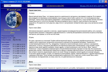 Выдаваемая характеристика дня содержит: лунный гороскоп, настроение, рекомендации по уходу за здоровьем и волосами, рекомендации бракосочетания, магическую составляющую дня, цвета, камни, условия медитации, рекомендации по развитию бизнеса и отношений с работодателями и т.д. В программу встраиваются дополнительные модули: сонник, гороскоп, тайны имени и т.д. (на данный момент происходит обкатка бета-версий модулей)