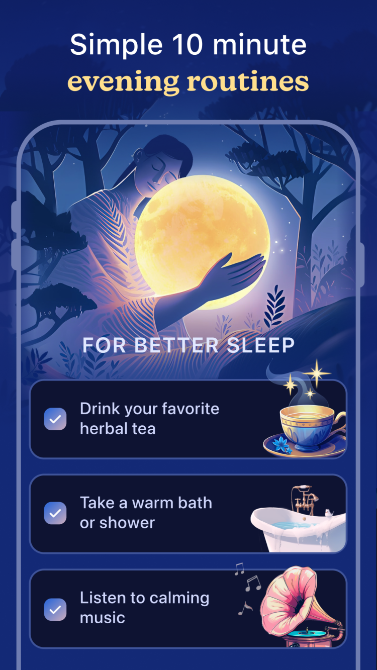 Lune: Bedtime Sleep Routine — идеальное мобильное приложение для тех, кто испытывает проблемы со сном. Разработанное с учетом современного образа жизни, оно помогает создать устойчивый режим сна и улучшить ваше самочувствие с течением времени.