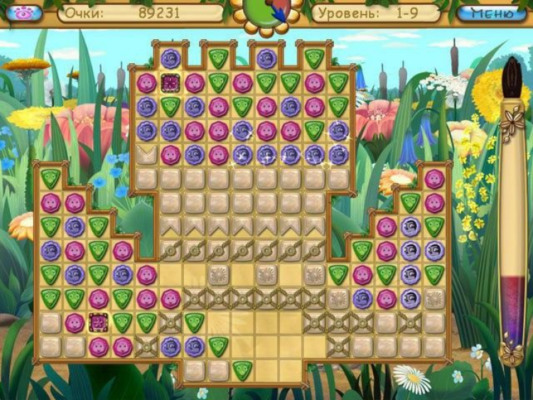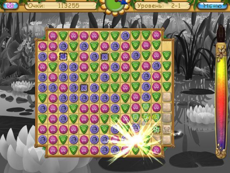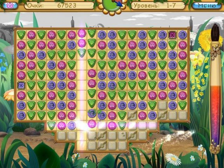 Померкло яркое солнышко, разноцветный мир стал серым и унылым. Кто сумеет вернуть ему пропавшие краски? Конечно же, ваш любимый непоседа в компании с Лунтиком! Игра адресована самым юным поклонникам казуальных развлечений, а также их уважаемым родителям. Вместе играть гораздо веселее! Цель игры в том, чтобы освободить заточенные в самоцветах краски, которые заново раскрасят потускневший мир. Выбирайте группы из трех (и более) одинаковых фишек, а затем кликайте по ним волшебной кисточкой. Используйте силы земной гравитации камни стремятся опуститься в низ игрового поля, причем некоторые из них утратили свой цвет и прозрачность. Чтобы убрать эту досадную помеху, необходимо активировать соседние самоцветы, либо использовать специальные бонусы. Их в игре несколько.