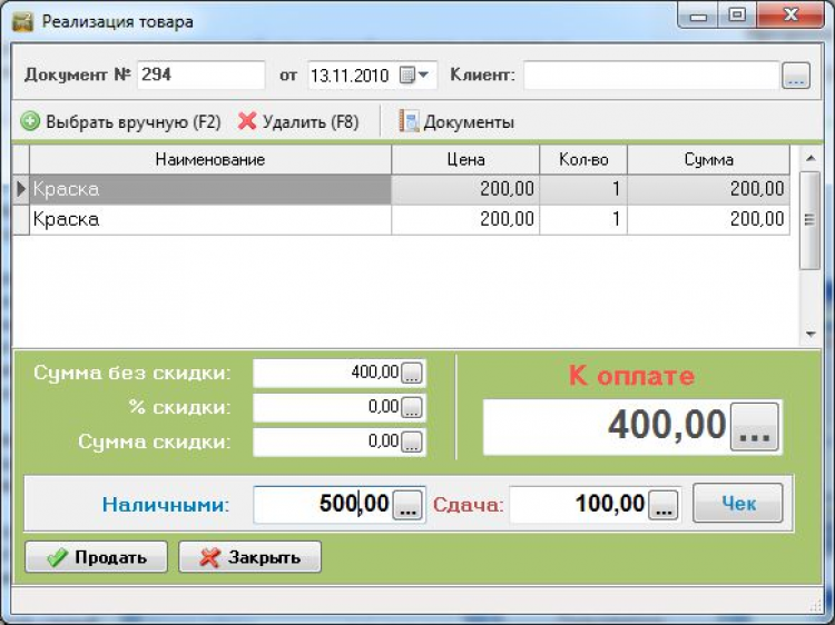 Автоматизирует процесс торговли, учитывает скидки покупателям, позволяет печатать отчеты, акты передачи, ведомости прихода товара, ведомости продаж за различные периоды, копии чеков, накладные и счета для оптовых покупателей и другие документы.