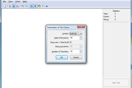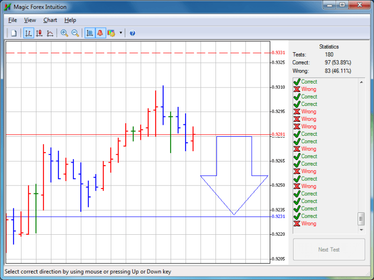 Программа предлагает пользователю определить дальнейшее движение цены (вверх или вниз) от стартовой линии (от цены закрытия последнего бара). Правильным направлением считается то направление, куда цена проходит определённое число пунктов от стартовой линии (например, 50 пунктов). Необходимо угадать правильное направление, а оно на каждом тесте меняется: программа использует генератор случайных чисел. От логики в данной ситуации толка мало: в данном случае теория вероятности не может дать 100% правильных ответов. Поэтому получаем верный ответ при помощи интуиции. Программа позволяет пользователю выбирать валютную пару (символ) и количество пунктов, которое должен пройти график для определения правильного направления.