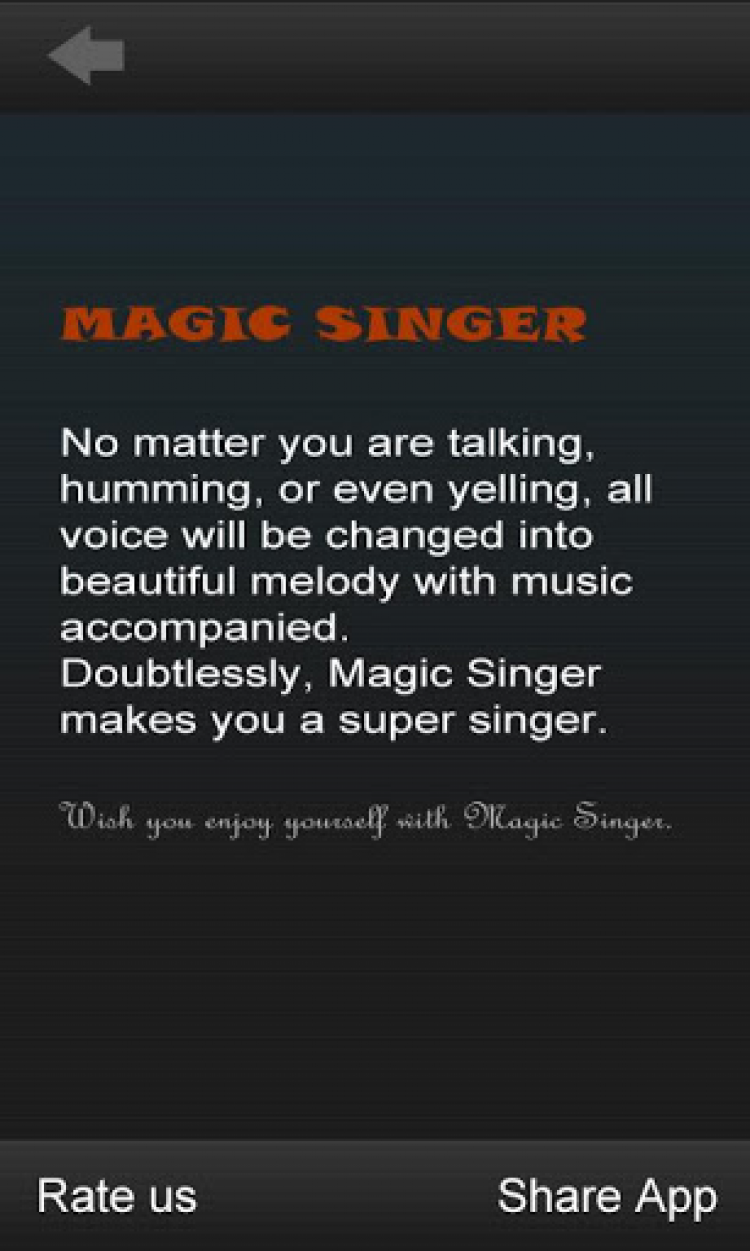 MagicSinger Эта программа позволит вам создавать прекрасную музыку, просто говоря в микрофон вашего мобильного устройства. Вы можете говорить, шептать, мямлить или кричать, а программа MagicSinger превратит ваш голос в музыку. Для этого необходимо просто выбрать мелодию по вашему вкусу, нажать на кнопку микрофона и начать говорить.