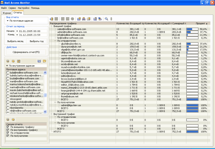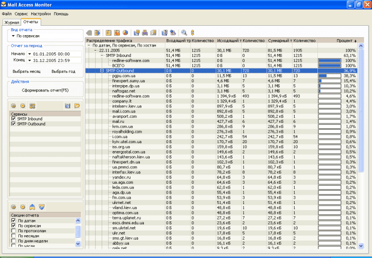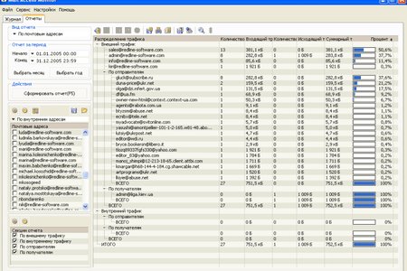 Анализируя эти лог файлы, Mail Access Monitor позволяет быстро и просто выдавать отчеты о том сколько, кто, кому, когда отправлял электронных писем и какой при этом получился суммарный почтовый трафик.