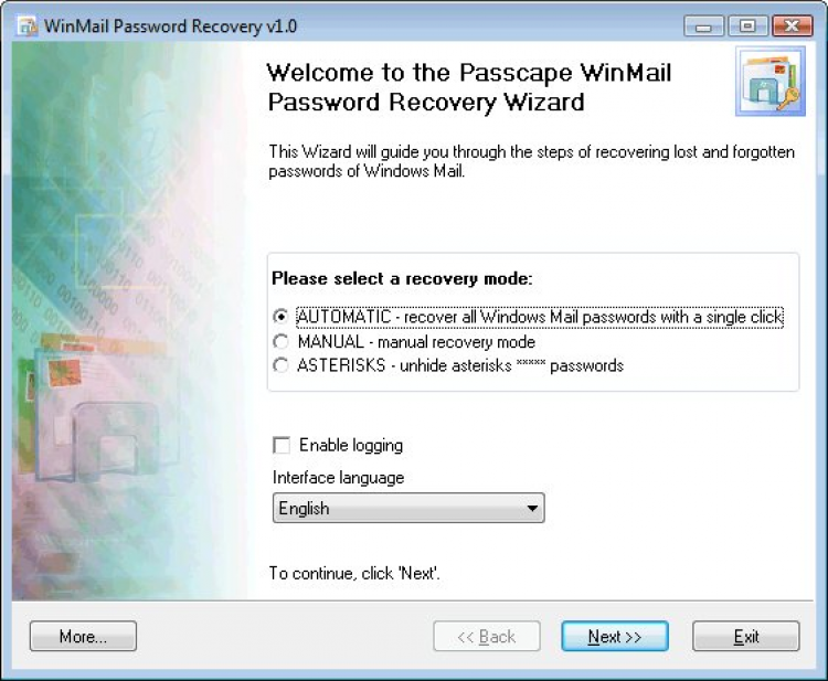 Windows Mail Password Recovery - это программа для чтения электронных сообщений, эксклюзивно поставляемая вместе с Windows Vista и имеющая мощную встроенную систему защиты информации пользователя. Однако, если вы запамятовали свой логин или пароль к почтовому ящику в Windows Mail, не отчаивайтесь. С помощью Windows Mail Password Recovery можно легко восстановить забытые пароли этого популярного почтового клиента. Программа рассчитана как на новичков, так и на продвинутых пользователей.
