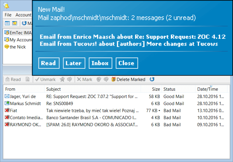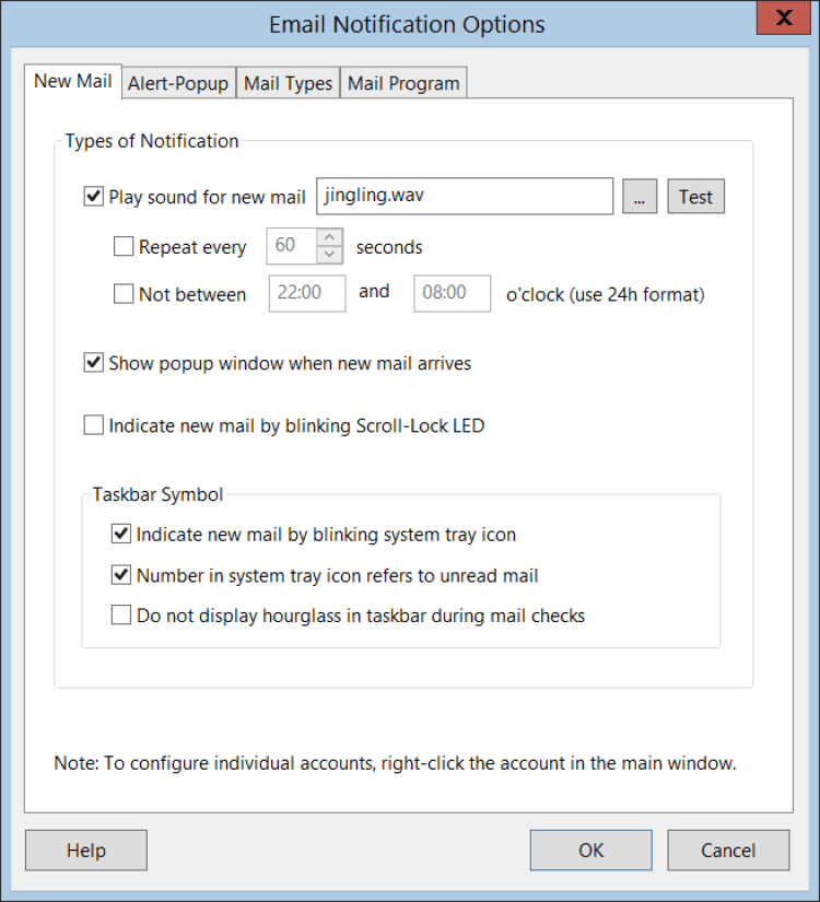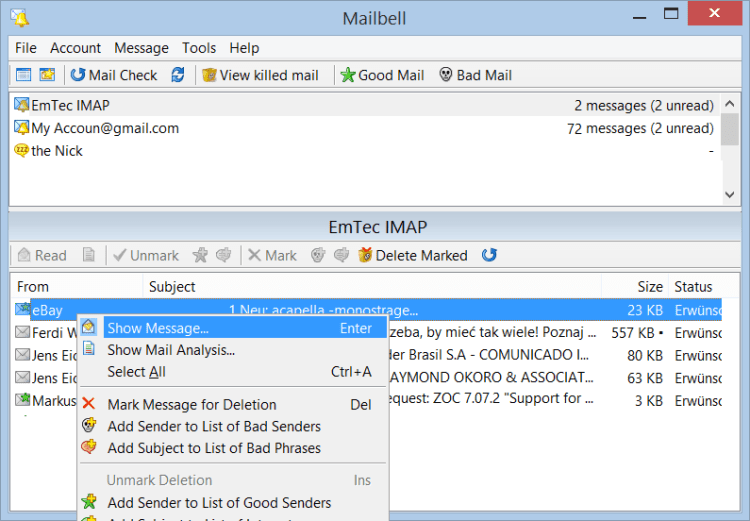 MailBell - это программа, уведомляющая вас о новых входящих электронных письмах. Программа может проверять один или несколько Email аккаунтов (POP3, IMAP, IMAP-SSL, MAPI, Hotmail Премиум) и уведомлять о новом входящем письме звуковым сигналом или всплывающим окном.