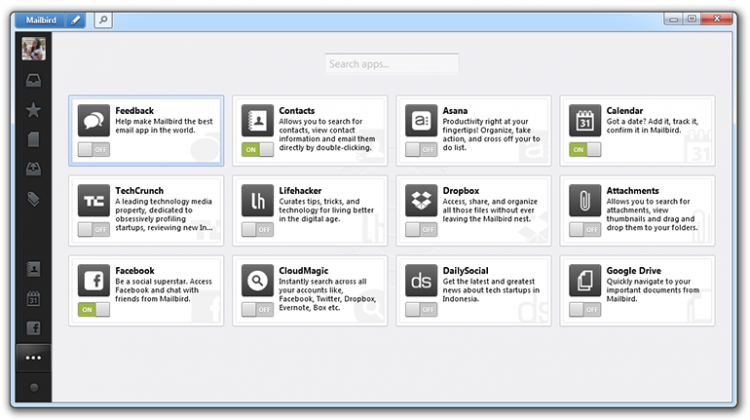 Mailbird Lite интегрируется в Facebook, Google Drive и Dropbox, может выступать в роли новостного агрегатора, собирая новости с таких ресурсов, как TechCrunch, LifeHacker, DailySocial и др.