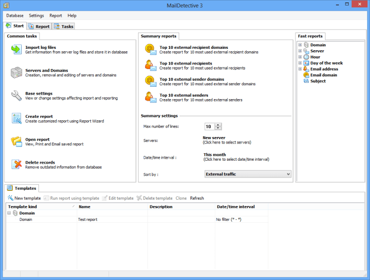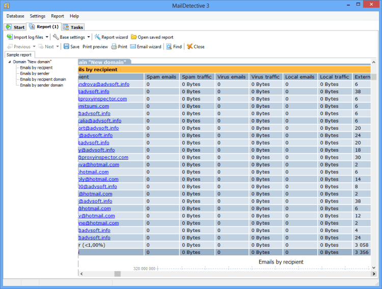 MailDetective for Exchange Server - это программа, которая позволяет анализировать почтовый трафик компании, используя в качестве исходных данных лог-файлы сервера. Отчеты, подготовленные программой, показывают распределение трафика по получателям и отправителям. Предусмотрена сортировка данных, печать и экспорт отчетов. Наглядное представление информации обеспечивается за счет использования диаграмм, параметры которых можно изменять в настройках отчета.