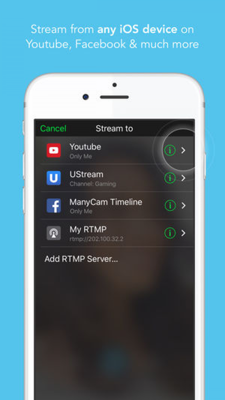 - Взаимодействие с популярными сервисами. ManyCam iOS выводит трансляцию на популярные видеохостинги, например, YouTube или Twich, а также позволяет вести трансляцию в Facebook. Пользователь может использовать другой сервис, добавив в настройках адрес хостинга. Видео будет транслироваться со всеми эффектами и установленными в программе фильтрами.