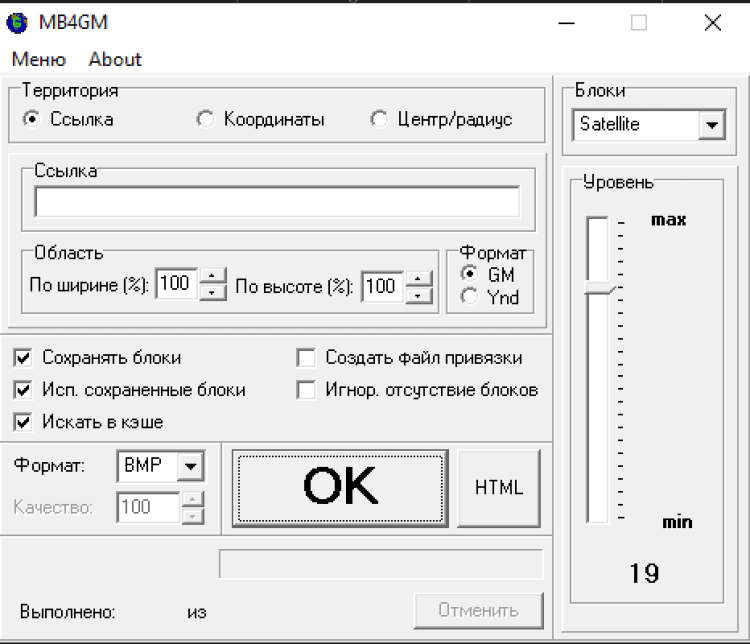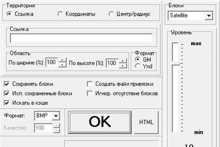 Вы указываете некоторую часть земной поверхности и желаемый уровень детализации. Программа скачивает с сайта Google Maps фрагменты изображения и склеивает их в один большой файл. Можно качать либо карты (Map), либо спутниковые снимки (Satellite). Есть возможность автоматического создания файла привязки полученного изображения для OziExplorer.