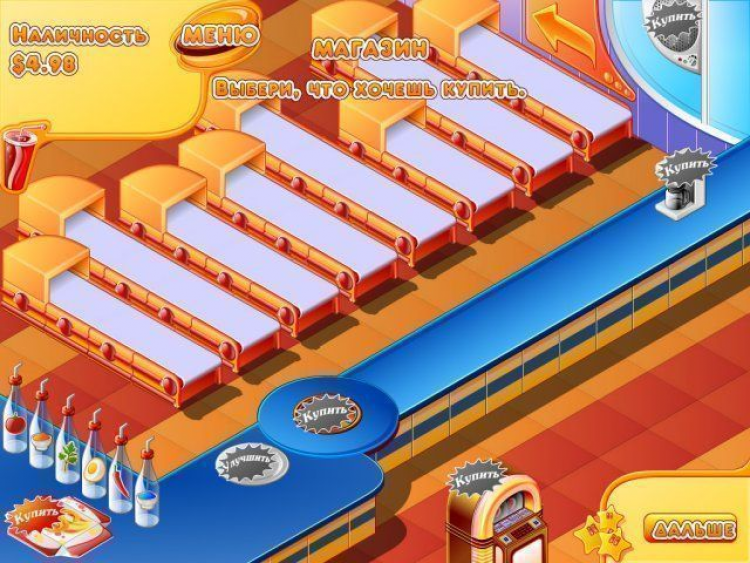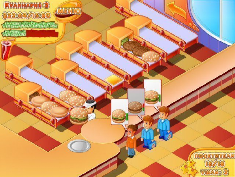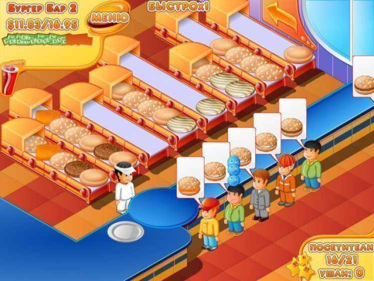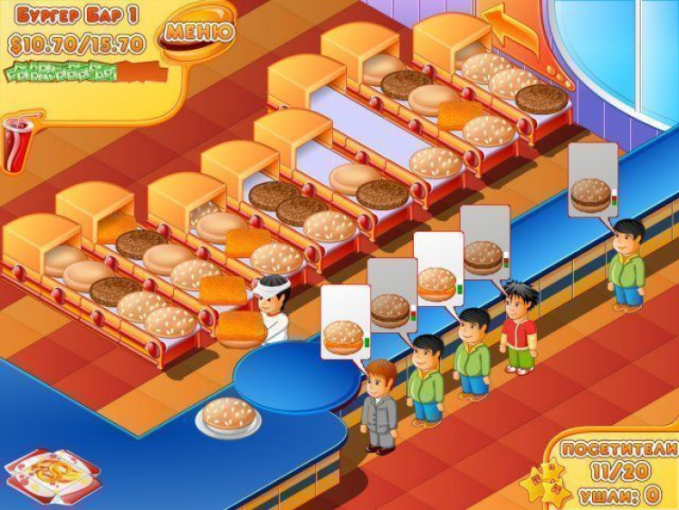 В каждом из этих заведений расположен прилавок и несколько конвейеров, по которым поступают компоненты гамбургеров, сендвичей, канапе и других близких и дальних родственников классического бутерброда. Из этих компонентов нужно приготовить вкусную снедь, за которую клиенты будут готовы как следует заплатить. Каждый из них хочет чего-то особенного, и угодить всем будет непросто. Вам придется раскрыть множество секретов, которые помогут превратить простую булку в настоящий деликатес. Чтобы справиться с этой задачей почаще заглядывайте в кулинарную книгу, которая подскажет новые рецепты блюд и соусов. Ситуация усложняется еще и тем, что на каждом уровне нужно заработать определенное количество денег на закупку продуктов. К тому же клиенты не любят ждать слишком долго. Если они устанут, то попросту уйдут обедать к конкурентам, и вы получите меньше прибыли.