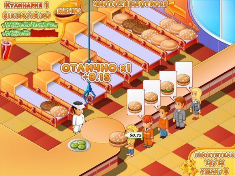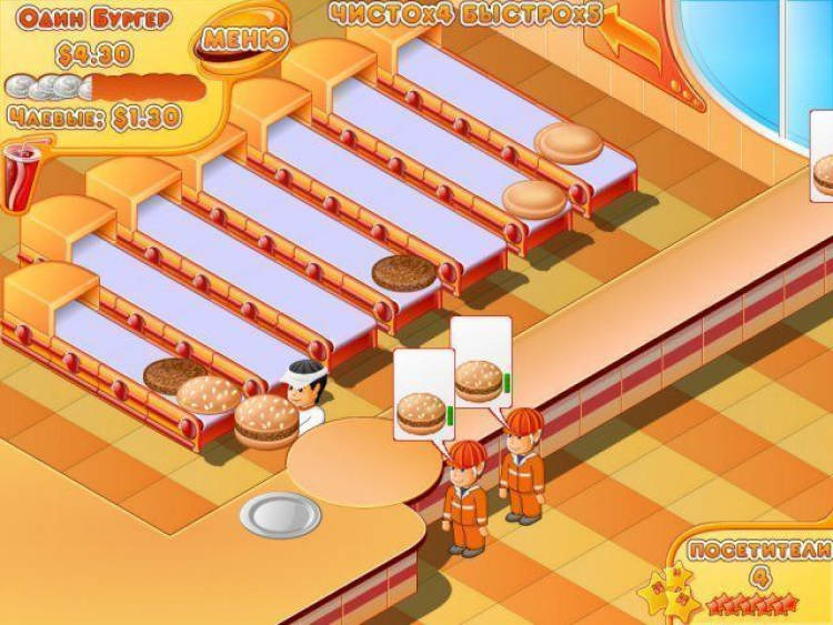 Чтобы избежать этого подумайте о комфорте персонала и посетителей. Если поставить в заведении кофемашину, то веселый поваренок сможет быстрее готовить бутерброды. Хороший вентилятор или кондиционер заставит посетителей дольше ждать заказа, ну а чтобы им не было скучно установите в своем кафе музыкальный автомат. Веселая игра Мастер Бургер обязательно понравится как юным, так и самым искушенным поклонникам динамичных компьютерных аркад. Впереди вас ждет множество интересных уровней, два альтернативных режима игры и обилие позитивных эмоций.