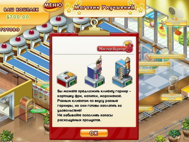 Не улучшить ли вам для начала свое меню? Попробуйте закупить в местном магазинчике разнообразные соусы для предлагаемых блюд. Экспериментируйте с тартаром, горчицей и кетчупом, улучшая вкус обычных начинок. Вкладывайте деньги в ассортимент фирменных соусов вашего заведения, и вы сможете продавать гамбургеры гораздо дороже.