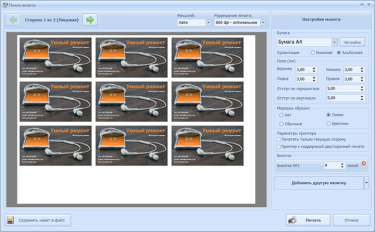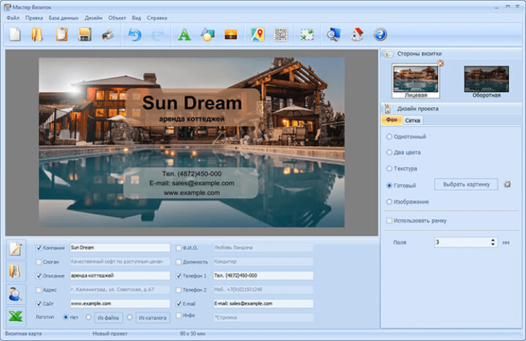 Включает более 340 готовых вариантов дизайна визитных карточек на самые разные темы, а также возможность создания собственных оригинальных стилей. Для подготовки красивой визитки достаточно ввести контактные данные, выбрать шаблон и отредактировать макет по своему вкусу. После этого вы сможете распечатать любое количество визиток на принтере или сохранить визитку для последующей печати.