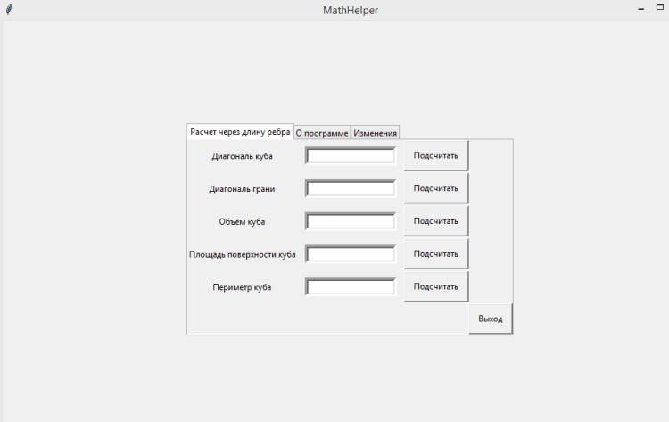 Калькулятор для подсчета данных геометрических фигур. Программа представляет собой калькулятор формул геометрических фигур с интерфейсом. Для использования калькулятора нужно выбрть фигуру и вкладку, а после чего в необходимом поле ввести данные и нажать подсчитать.