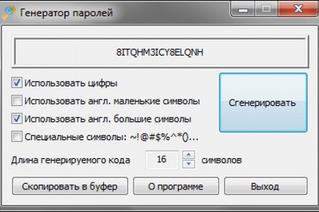 MaxLim Генератор паролей - это небольшая программа для генерации паролей. В программе можно указать из каких символов создавать пароль, какой длинны должен быть пароль. Программа будет удобна всем, кому необходимо придумывать много разных паролей. С помощью программы, которая генерирует пароли, придумываются самые безопасные пароли, ведь подобрать такие пароли практически невозможно. А если нужно сделать пароль еще защищеннее, то добавьте в пароле специальные символы, такой пароль уж точно на 100 процентов некто не сможет подобрать.