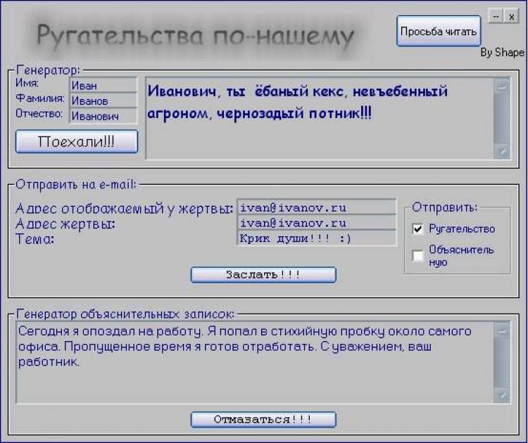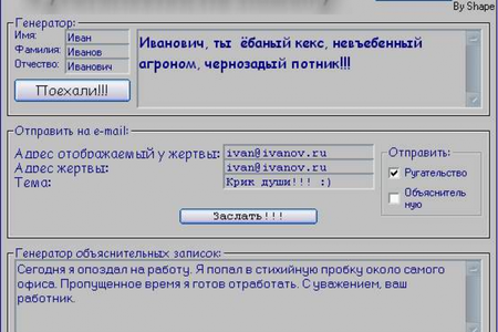 Маза по-нашему - это программа составляет объяснительные записки, на тот случай если вы куда-нибудь опаздываете или не успеваете, ну или же просто не хотите идти! Так же в программу встроен генератор ругательств. Программа имеет свой собственный smtp сервер т.е. вы можете прямо из прогарммы послать записку или ругательство на e-mail.