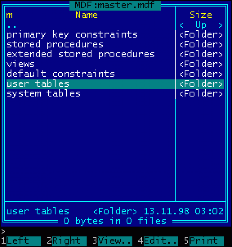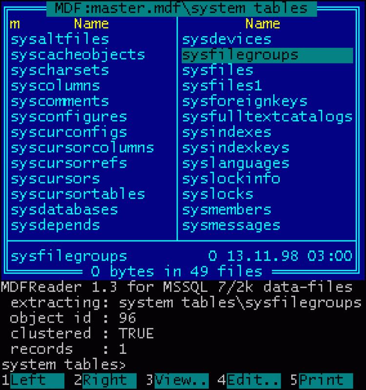 MDF Reader for MS-SQL 7/2k - это утилита для работы с mdf-файлами и бэкапами, как с архивами. Работает с большими файлами (>4Gb). Можно (и нужно) подключать к Multiarc плагину в FAR-е. Умеет доставать данные из таблиц, схемы таблиц, хранимые процедуры. С таблицами работает через IAM (с некоторыми системными таблицами или в случае невозможности работы через IAM - по кластерному индексу).