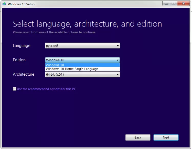 Следующим шагом Media Creation Tool предлагает выбрать язык системы, редакцию ОС и ее архитектуру (x32 или x64). Выбрав желаемый вариант ОС остается только указать флешку для записи образа или папку для его сохранения. Минимальный рекомендуемый размер флешки - 3 Гб.