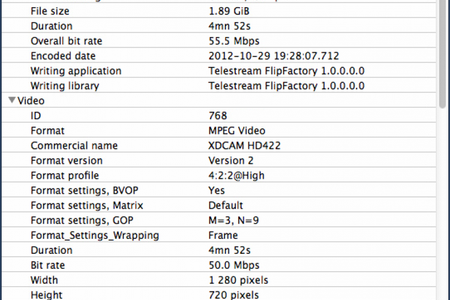 MediaInfo позволяет получить исчерпывающую информацию о любом видео файле, от названия, размера, продолжительности и размера файла и до используемого кодека, битрейта, количества канал, разрешения и пр. MediaInfo поддерживает следующие форматы: