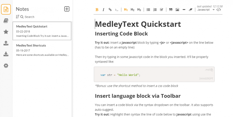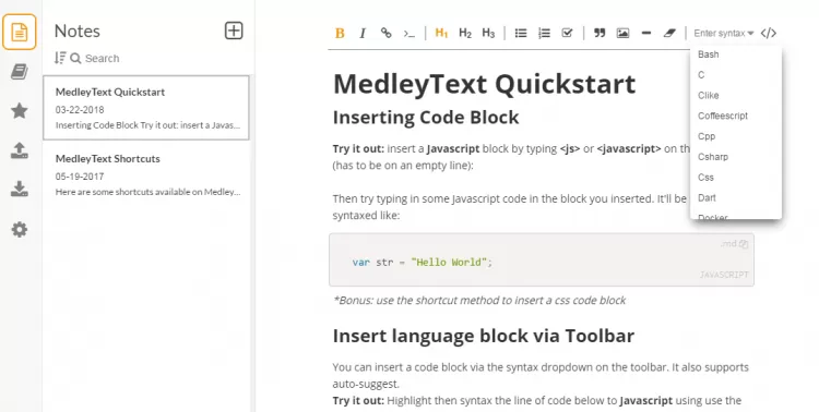 MedleyText Это мощный менеджер заметок, предназначенный в первую очередь для разработчиков. Он поддерживает множество языков программирования, поддерживает подсветку синтаксиса, позволяет вставлять в заметки блоки кода, гиперссылки, изображения и многое другое.