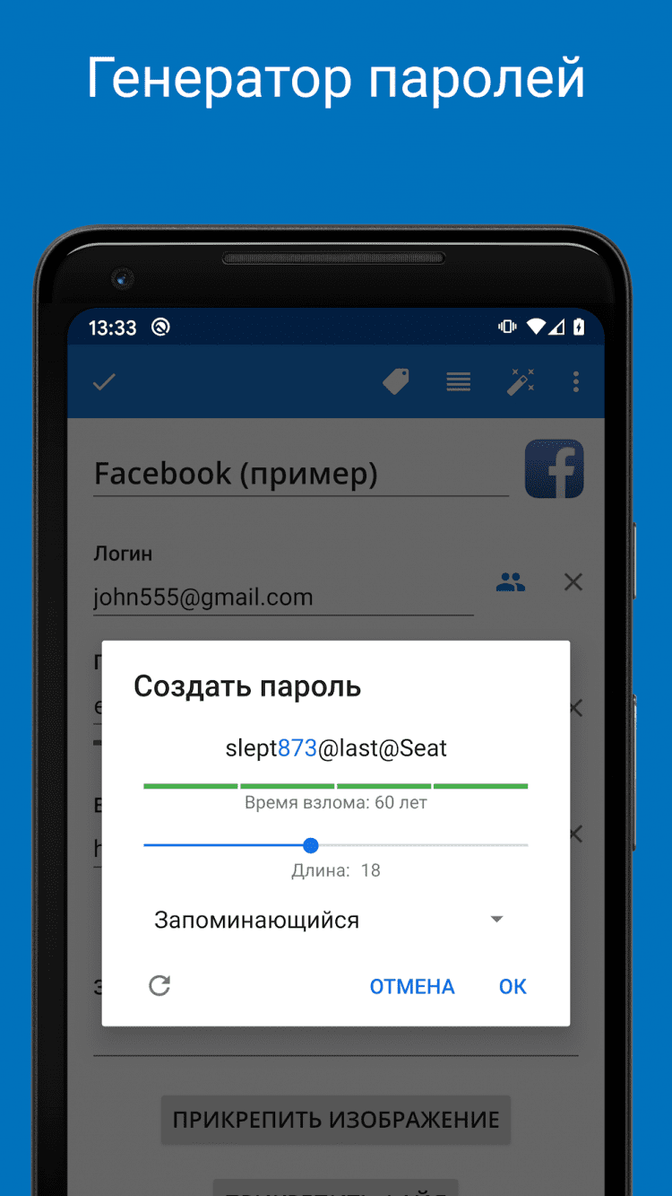 Помимо этого, приложение SafeInCloud обладает встроенным генератором паролей. Он поможет с легкостью создать надежный, запоминающийся пароль, стойкий ко взлому, в мгновение ока.