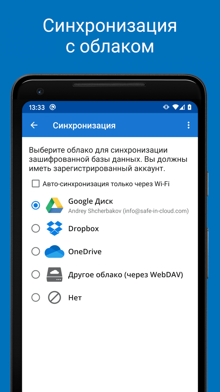 Сохраненные в программе данные можно синхронизировать с другими вашими мобильными и настольными устройствами, благодаря функции синхронизации с облаком. Для этого, вам потребуется иметь аккаунт в сервисе Google Диск, Dropbox, OneDrive или Яндекс Диск.