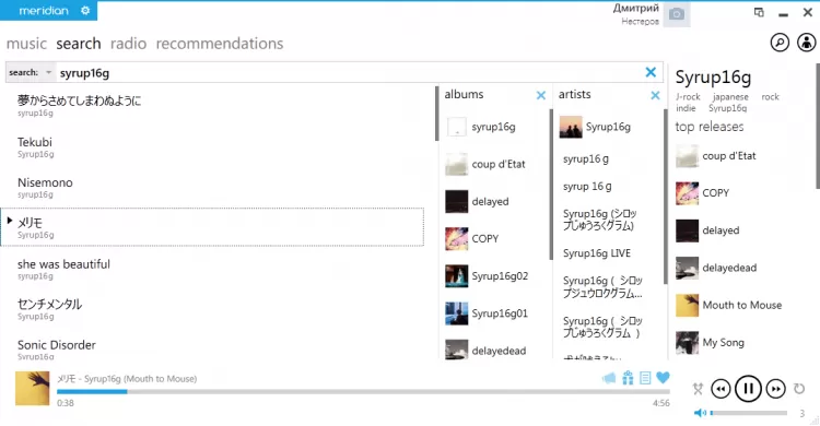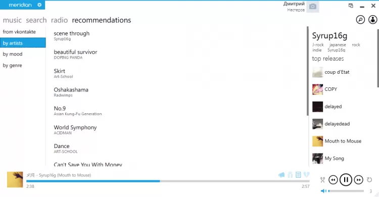 С помощью Meridian вы можете слушать свои аудиозаписи и искать новые. Вы можете слушать аудиозаписи ваших друзей, а если вам понравилась песня, добавить ее к своим аудиозаписям. Музыку можно искать по исполнителю, названию трека или альбома. Также можно искать исполнителей по жанру. На основе прослушанных треком Meridian можете составить для вас список рекомендаций, который поможет открыть что-то новое для себя. Плеер также позволяет выбирать и слушать интернет радиостанции.