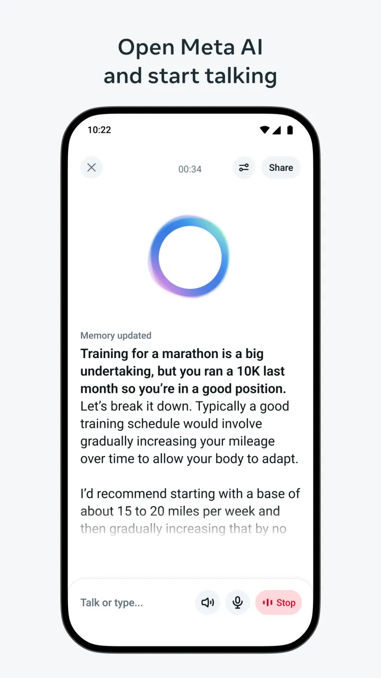 Meta AI — это умный помощник на базе искусственного интеллекта, который учится у вас и адаптируется к вашим предпочтениям в режиме реального времени. Помогает повысить вашу производительность и упростить выполнение повседневных задач, с экрана вашего смартфона.