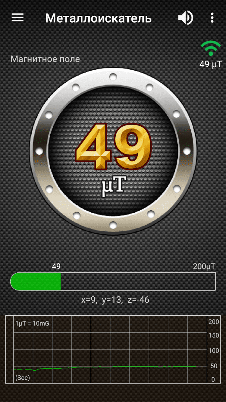 Металлоискатель поможет выполнить поиск металлов, используя для этого магнитный датчик вашего мобильного устройства. В природе интенсивность магнитного поля составляет около 49 μT или 490 mG (1μT = 10 mG). Это значение изменяется при присутствии в зоне чувствительности датчика различных металлов. Это и позволяет находить их при помощи этой программы.